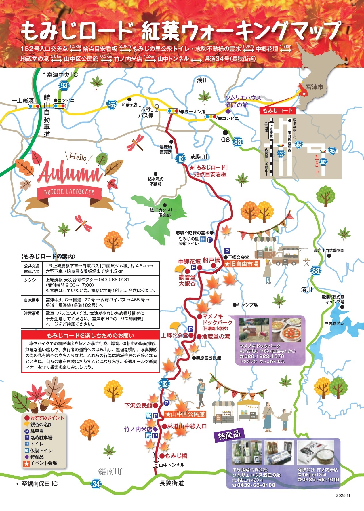 JR内房線上総湊駅下車「戸面原ダム行き」バスに乗り「六野」バス停下車、「もみじロード」県道入口看板まで徒歩約5分、もみじロード鑑賞始点看板まで徒歩約15分
