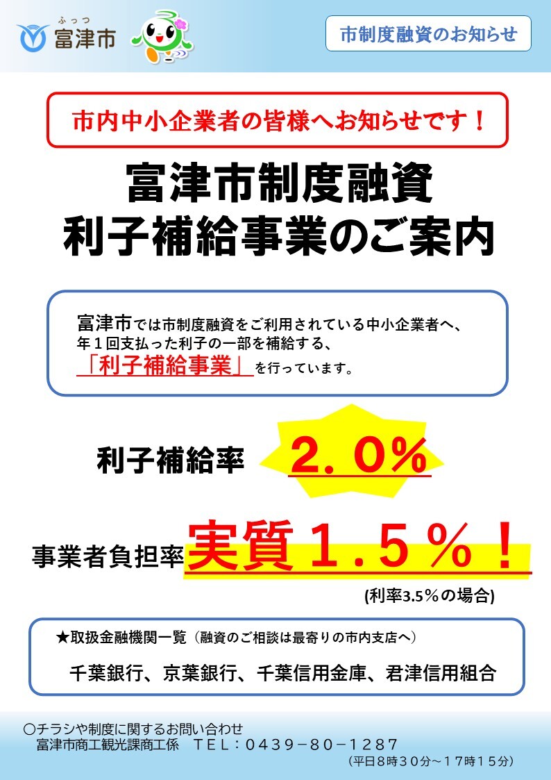 詳細は商工観光課(電話0439-80-1287)、中小企業庁(別ウインドウで開く)(電話03-3501-1511)、千葉県商工労働部経営支援課(別ウインドウで開く)(電話043-223-2707)、千葉県信用保証協会(別ウインドウで開く)(電話043-221-8111)までお問い合わせください。