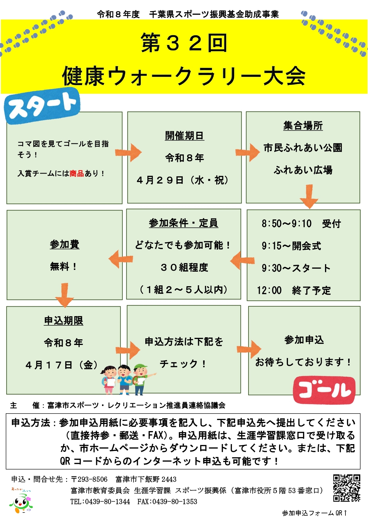 富津市スポーツ・レクリエーション推進員連絡協議会主催の「第32回健康ウォークラリー大会」の参加者を募集しています。