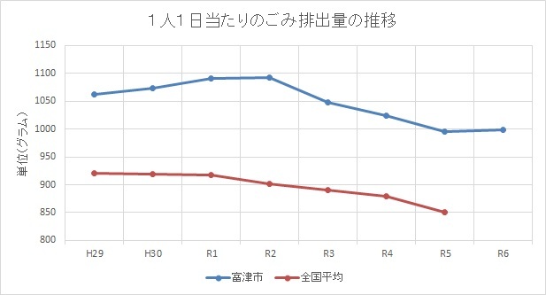 令和6年度の1人1日当たりのごみの排出量は999gで、基準の平成29年度と比べると63gの減量となりました。