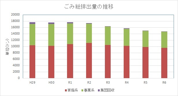 ごみの総排出量は平成29年度から17,000トン前後を推移し、令和元年度以降は減少を続けています。
