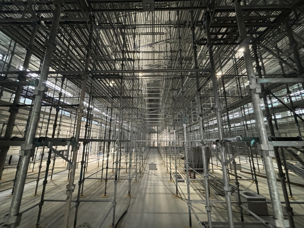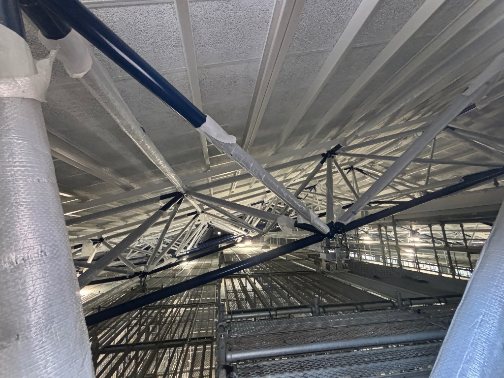 外壁の型枠が外れ、鉄骨トラスが組み上がりました。