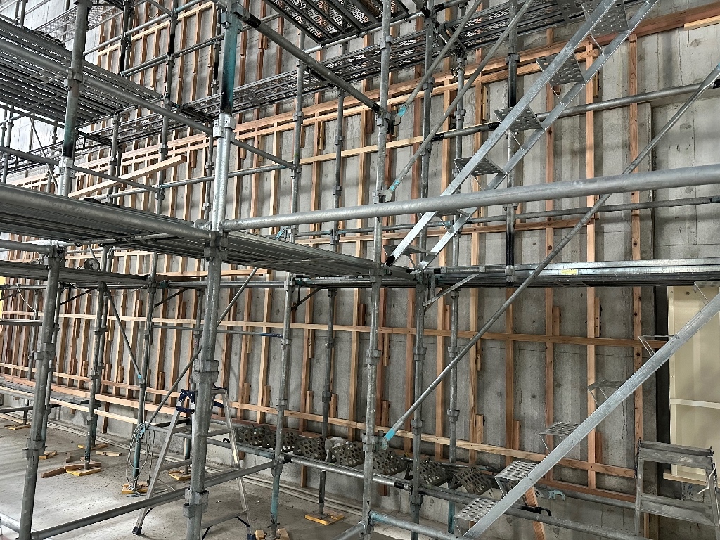 2階の壁を造るため、足場を組んでいます。足場が完成したら鉄筋を組んでいきます。