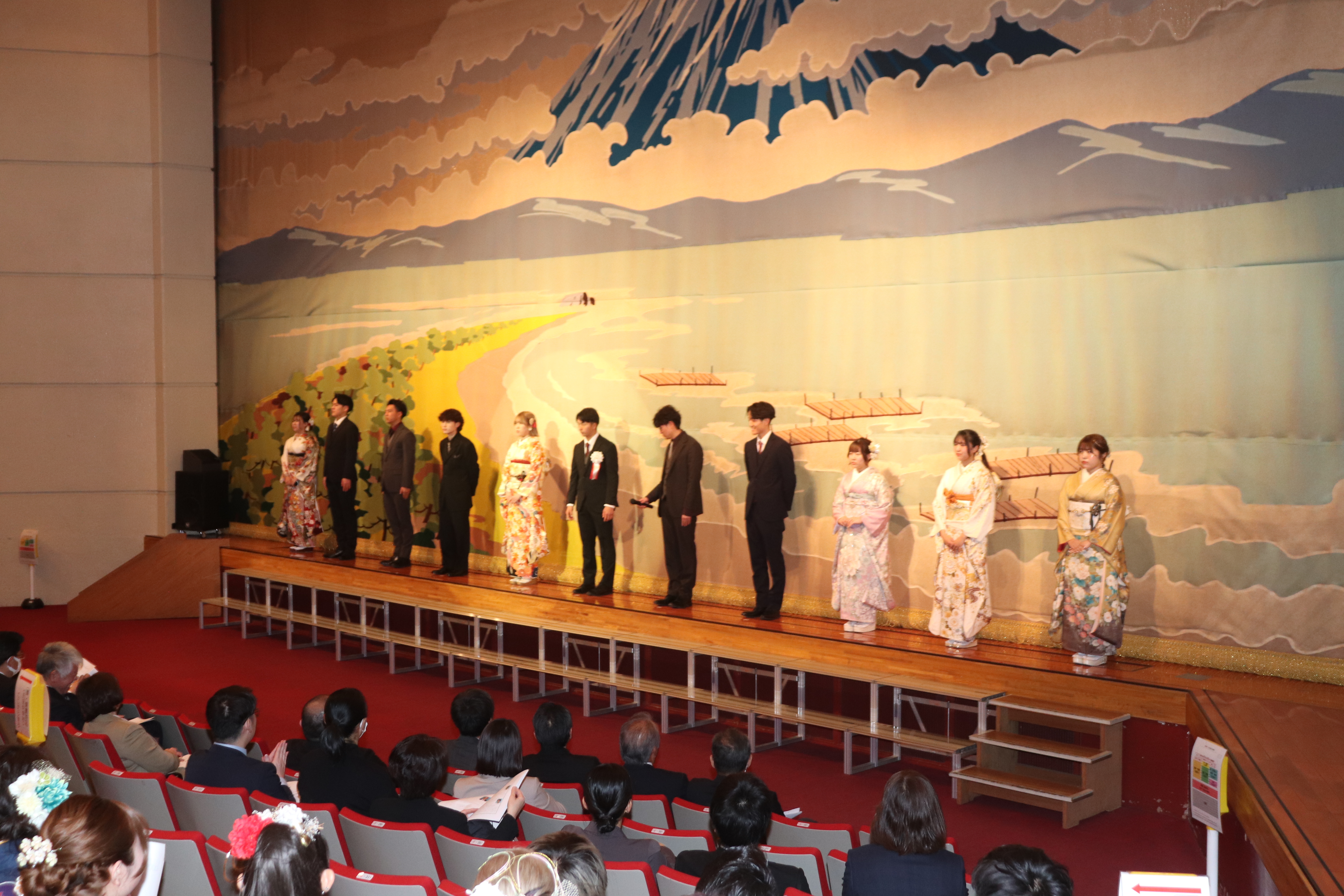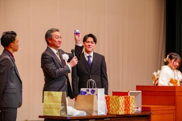 式典の部では、実行委員による司会進行、牧野耕大実行委員長による「二十歳代表挨拶」など、記念行事では、富津市の名所や懐かしい思い出をテーマにしたビンゴゲーム「ふっつ×世代ビンゴ!」を行い、最後に三本締めで閉式しました。