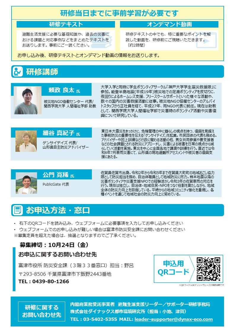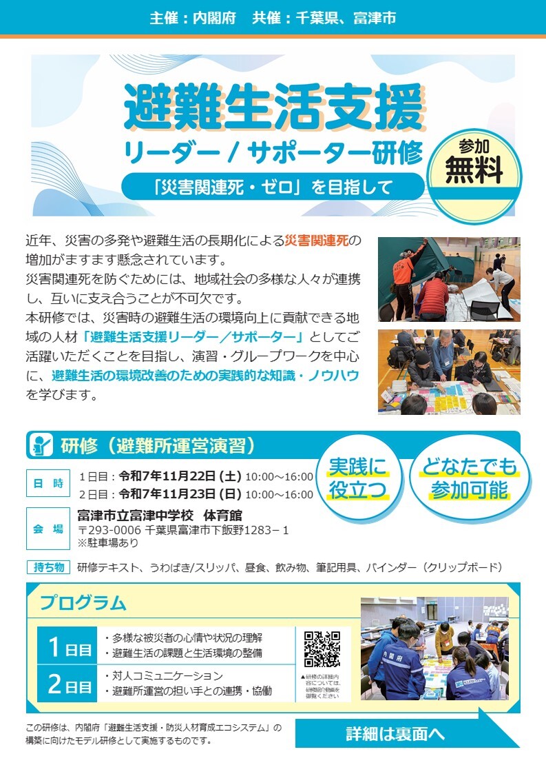 本研修は、災害時の避難生活環境の理解及び避難者とのコミュニケーションスキルを体系的に学ぶことで、地域の防災力向上につなげることを目的として実施するものですので、積極的な研修参加をよろしくお願いします。