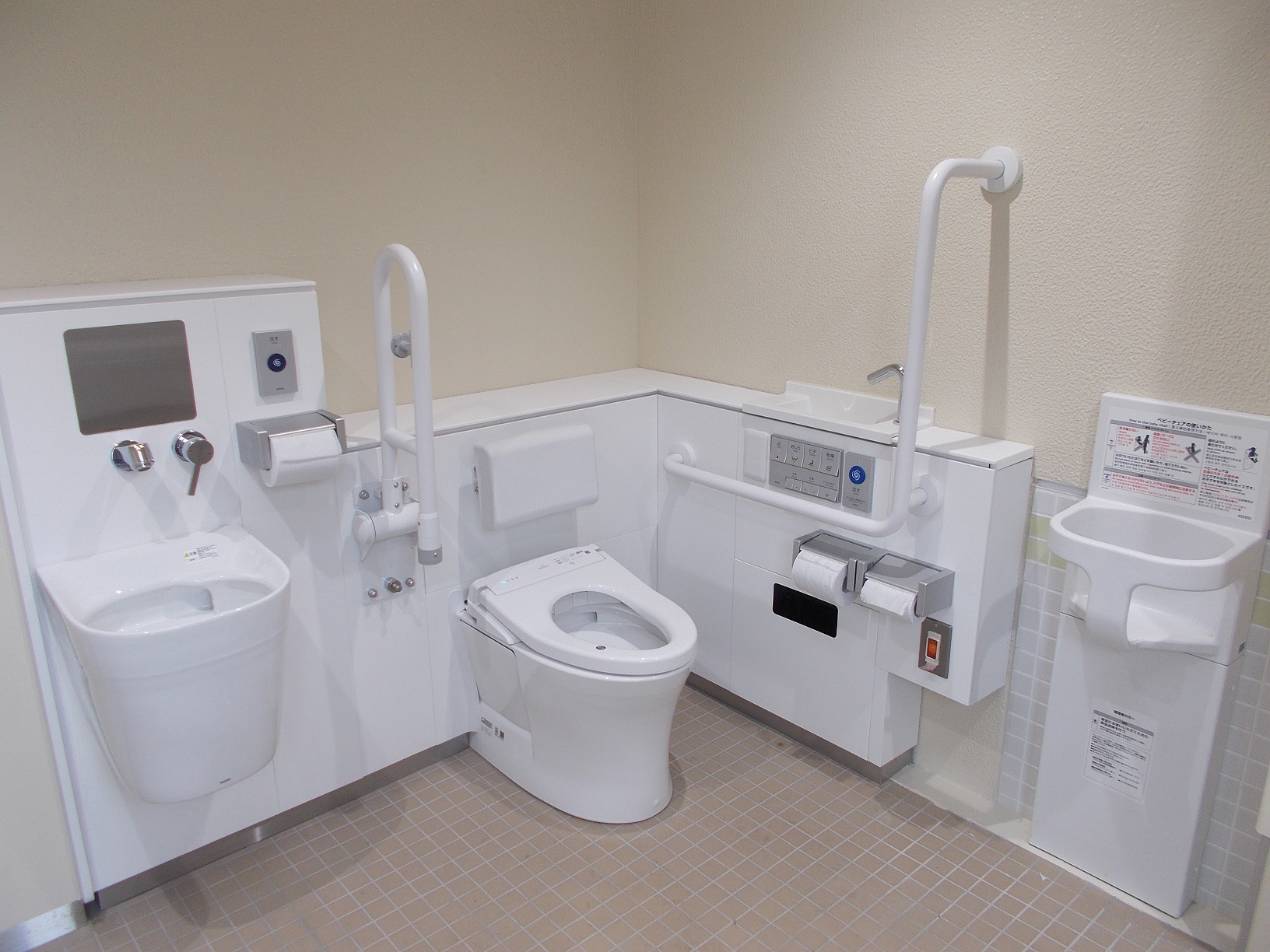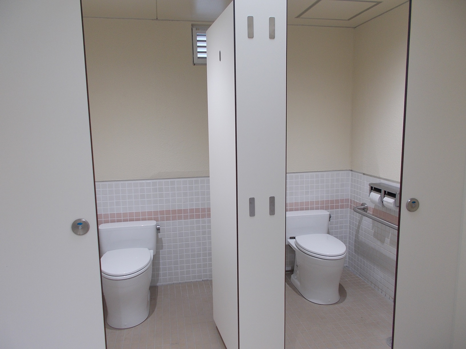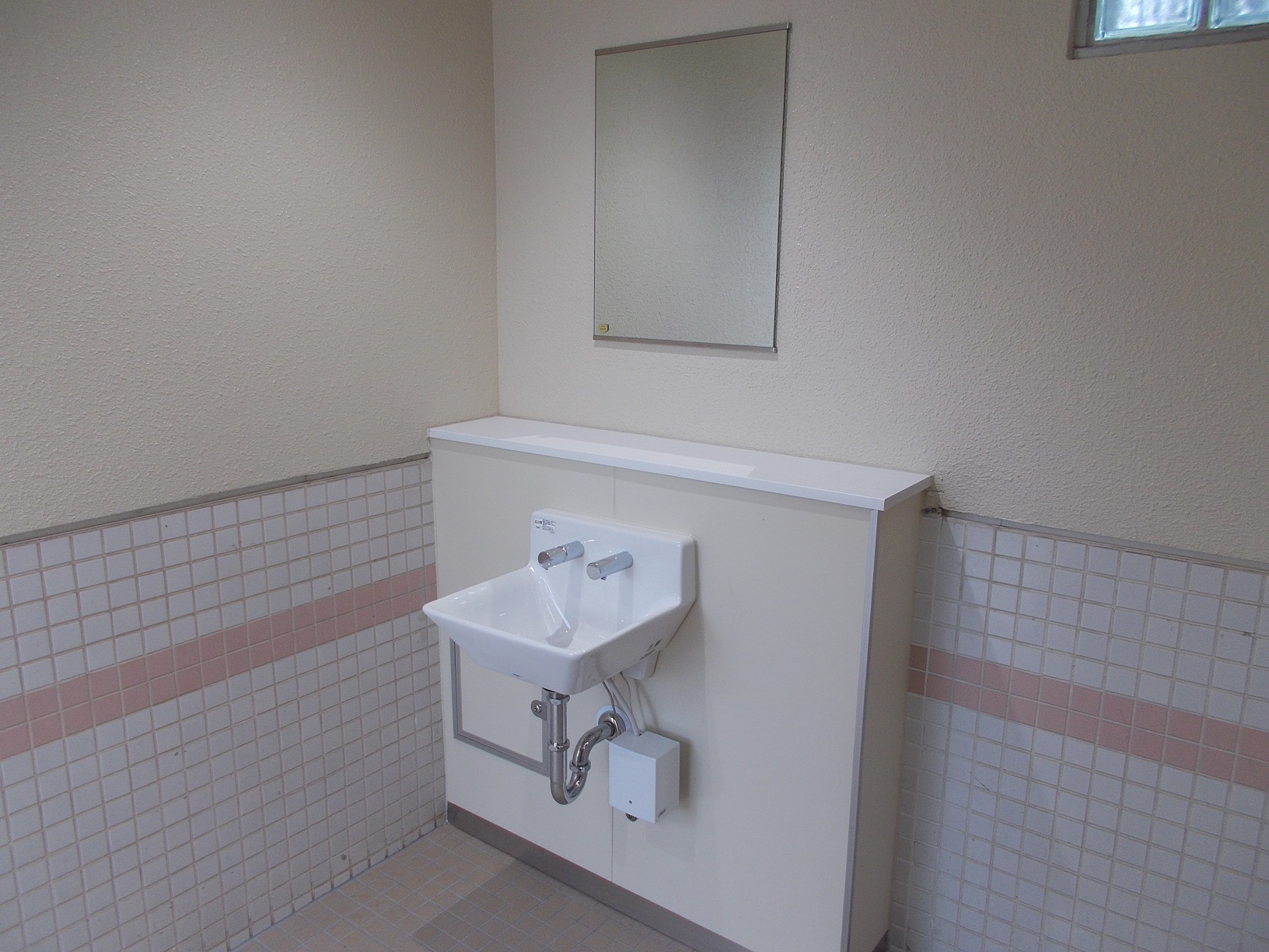 男女ともに手洗い場の自動水洗化、洋式便器を設けました。また、多機能トイレにはオストメイトパックやベビーチェアを設置し、より機能性の高いトイレになりました。