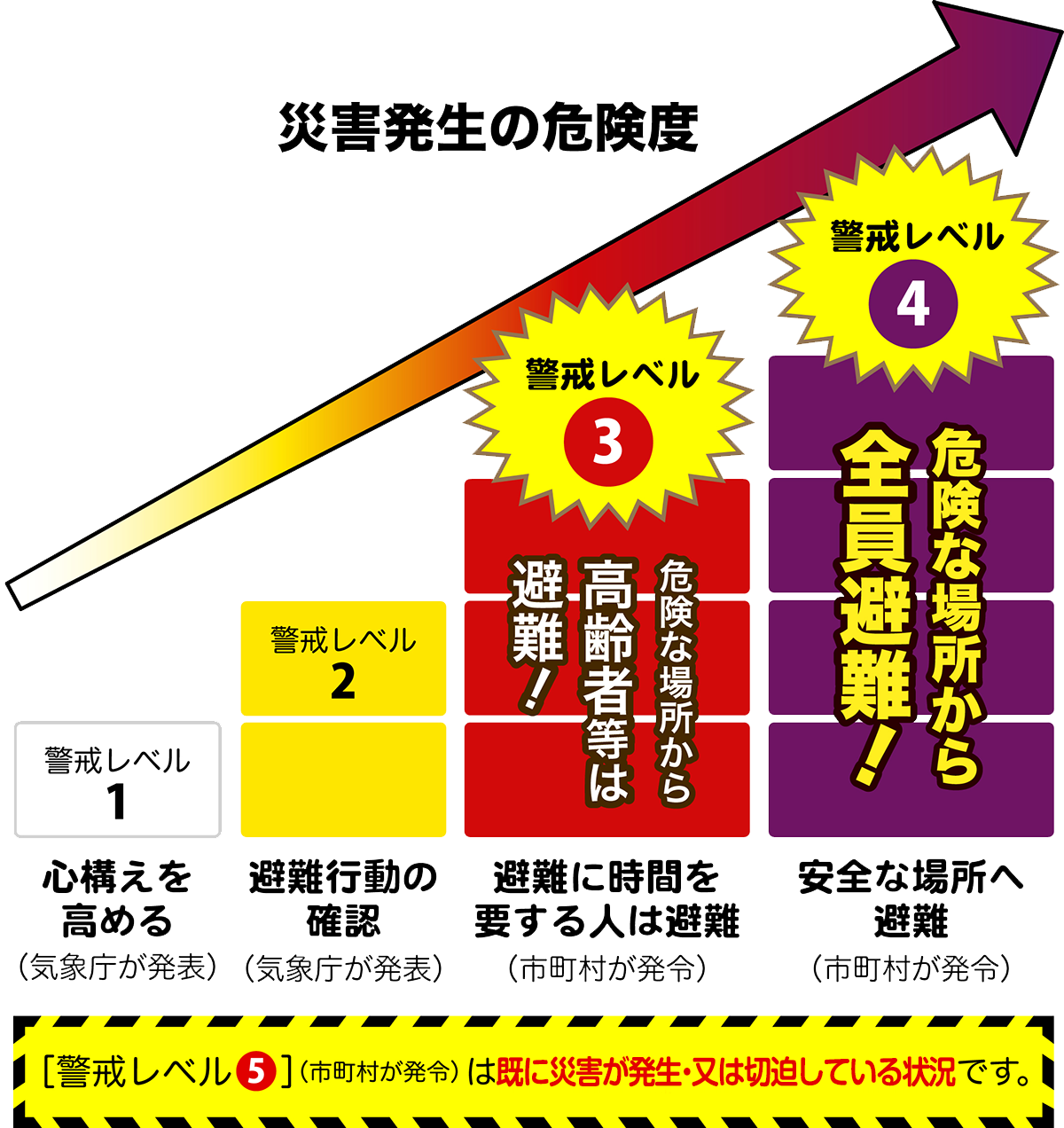 住民の皆さんが災害発生の危険度を直感的に理解し、的確な避難行動がとれるよう、避難情報や防災気象情報といった防災情報を5 段階の『警戒レベル』を用いてお伝えしています。